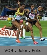 VCB, Felix, JeterUntil someone proves otherwise there are only two women that matter as we await the first gun – Veronica Campbell Brown (JAM, 21.74) and Allyson Felix (USA, 21.81). Campbell Brown is the two time defending Olympic champion, and will be gunning for an unprecedented three peat! Felix is the double silver medalist and a three time World champion who would love to take this crown from VCB the way VCB stopped Felix’ attempt at a historical four peat at Worlds last year.